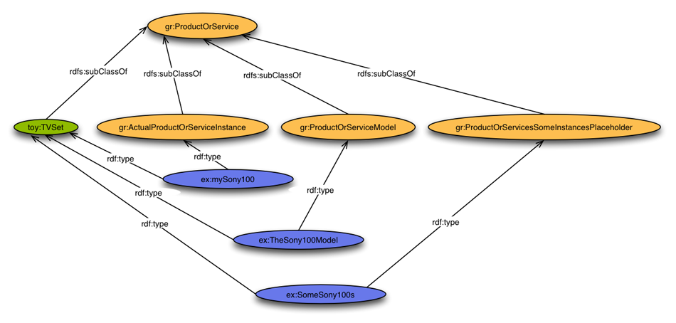 When annotating an entity, we can then be more specific and say that the entity is either a model or a product or a placeholder for anonymous instances. The difference between actual instances, models, and anonymous instances of a product or service is then expressed by making a particular object the intersection of both the product category and one of the three subclasses of gr:ProductOrService.